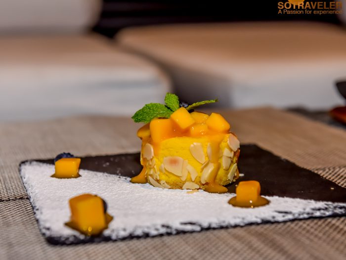 ยังไม่หมดเพียงเท่านี้ ยังสามารถสั่งขนมหวานปิดท้ายมื้ออาหารได้อีกคนละ 1 อย่าง เมนูแนะนำที่พลาดไม่ได้เลยคือ ชีสเค้กมะม่วง (mango cheesecake) หรือจะเลือกเป็นพานาคอตต้าและครมบรูเล่ก็ได้เช่นกัน