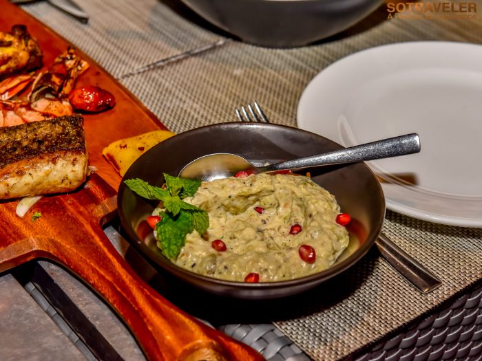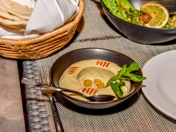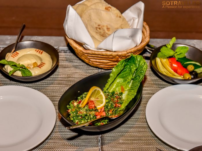 เริ่มต้นกันด้วยมิกซ์เมซซ่า (mixed mezze) 3 ชนิด ฮัมมัส (Hummus) เครื่องจิ้มสไตล์ตะวันออกกลาง มีส่วนประกอบหลักเป็นถั่วลูกไก่, บาบากานูช (Baba Ghanouj) มะเขือยาวบด, ทาบูเล่ (Tabouleh) สลัดเลบานิสที่ประกอบด้วยพาสลี่ย์สับละเอียด คลุกกับน้ำมันมะกอก และเกลือ เสิร์ฟคู่กับแป้งพิต้า เนื้อนุ่มเหนียวเคี้ยวหนุบ ตามแบบฉบับของเมดิเตอร์เรเนียน สามารถสั่งมาทานได้แบบไม่จำกัด