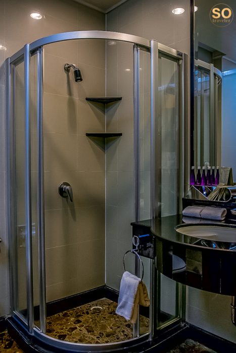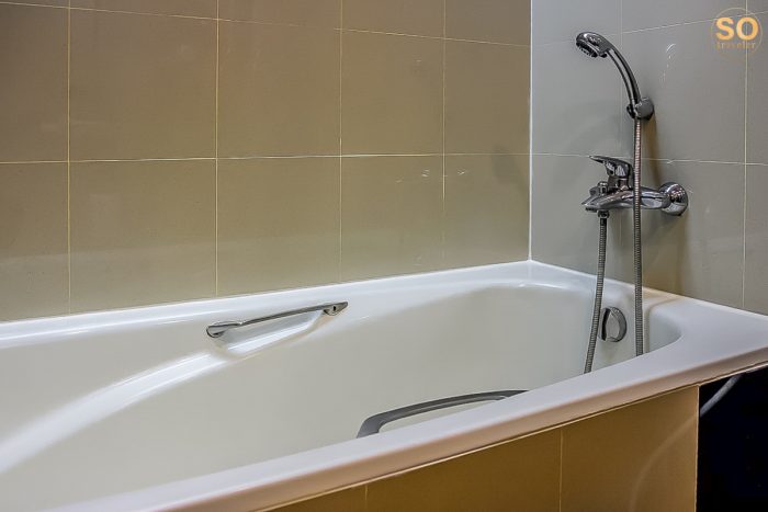 ในส่วนของห้องน้ำมีการตกแต่งไปในโทนสีขาวสว่าง มีทั้งอ่างอาบน้ำ และฝักบัว