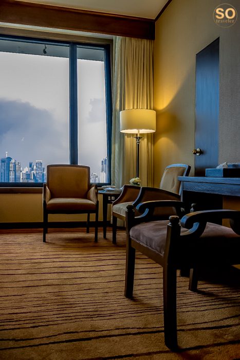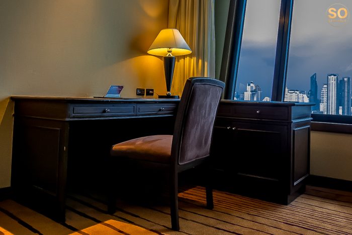 บรรยากาศของห้องพักตกแต่งให้ดูหรูหราและปลอดโปร่งโดยการเลือกใช้เฟอร์นิเจอร์ส่วนใหญ่เป็นไม้ปาเก้เคลือบมัน พื้นห้องปูด้วยพรมสีน้ำตาลอ่อน ควบคู่กับลายตัดสีดำบนตัวพรม ที่เข้ากันได้ดีกับบรรดาเฟอร์นิเจอร์และสีของผนังของที่ออกไปในทางสีเหลืองครีม ทำให้บรรยากาศภายในห้องกลมกลืนกันดี หน้าต่างขนาดใหญ่ทำให้บรรยากาศของห้องปลอดโปร่งและไม่ทึบจนเกินไป อีกทั้ง ยังสามารถรับชมวิวทิวทัศน์อันสวยงามของกรุงเทพมหานครฯ ได้จากบริเวณหน้าต่างของห้องอีกด้วย
