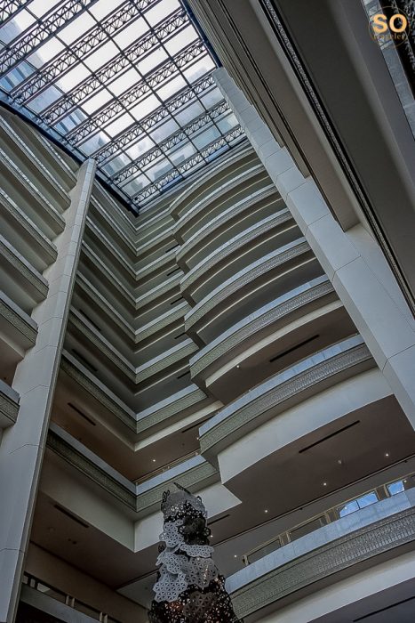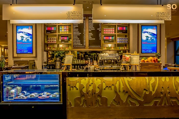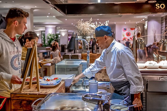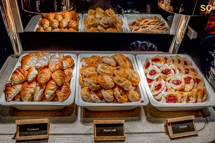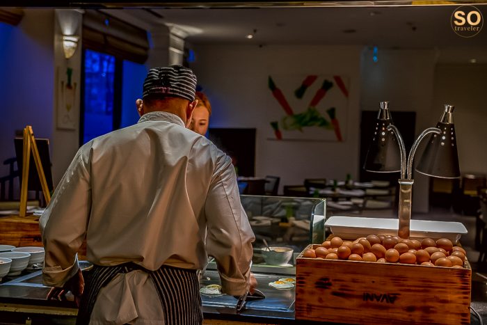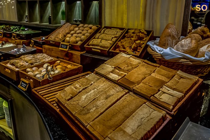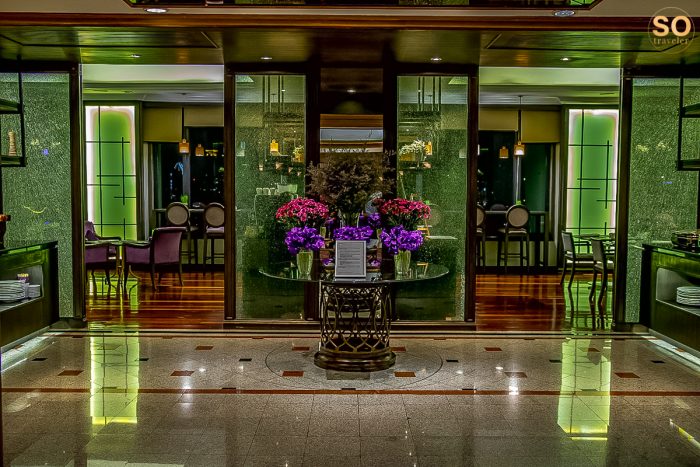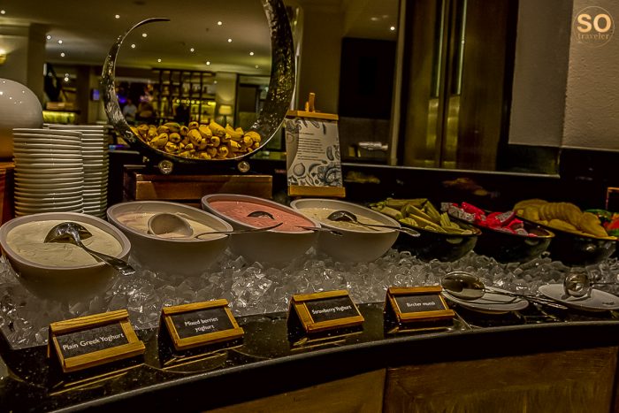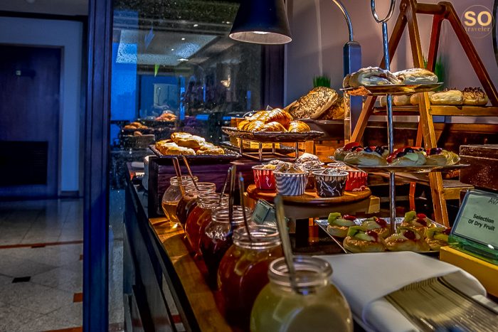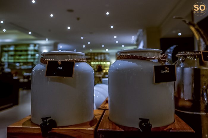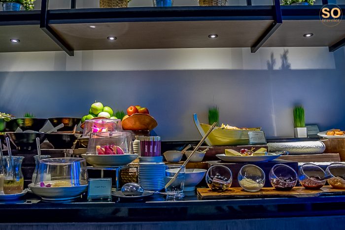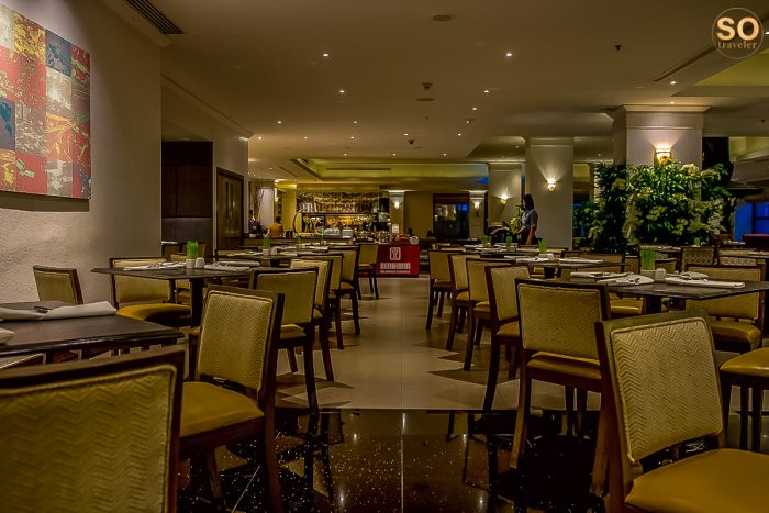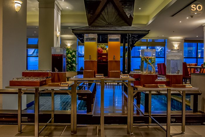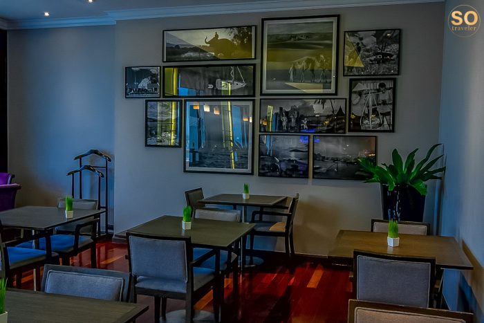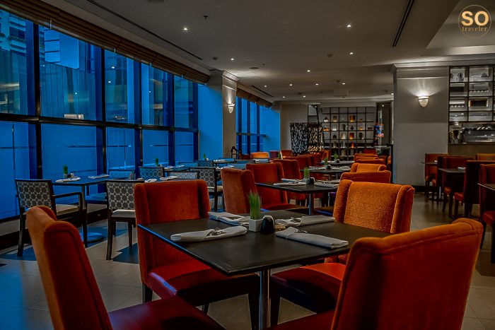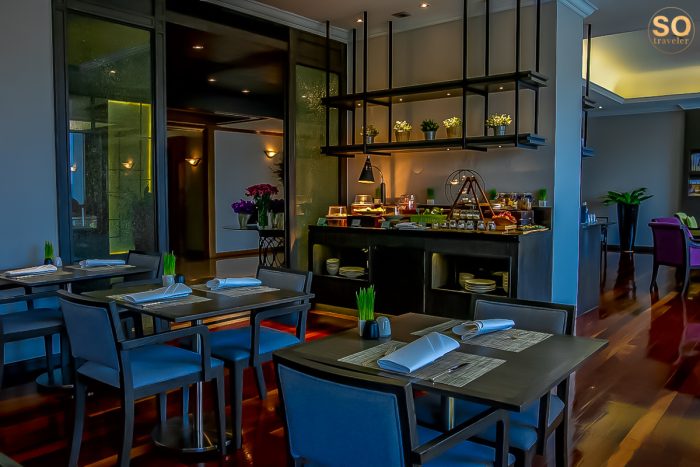 นอกเหนือจากในส่วนของ Executive Lounge นั้น ก็ยังมีในส่วนของบุฟเฟต์อาหารเช้าบริเวณชั้น 1 ของโรงแรมที่มีบรรยากาศกว้างขวางให้ความรู้สึกปลอดโปร่ง แม้ว่าโทนสีภายในจะใช้เป็นโทนสีทึบและไฟที่แสงออกเป็นสีเหลืองก็ตาม แต่ด้วยแสงที่ส่องผ่านเข้ามาจากภายนอก ก็ช่วยทำให้บรรยากาศของห้องอาหารในบริเวณชั้นล่างดูไม่มืดทึบมากจนเกินไปนัก