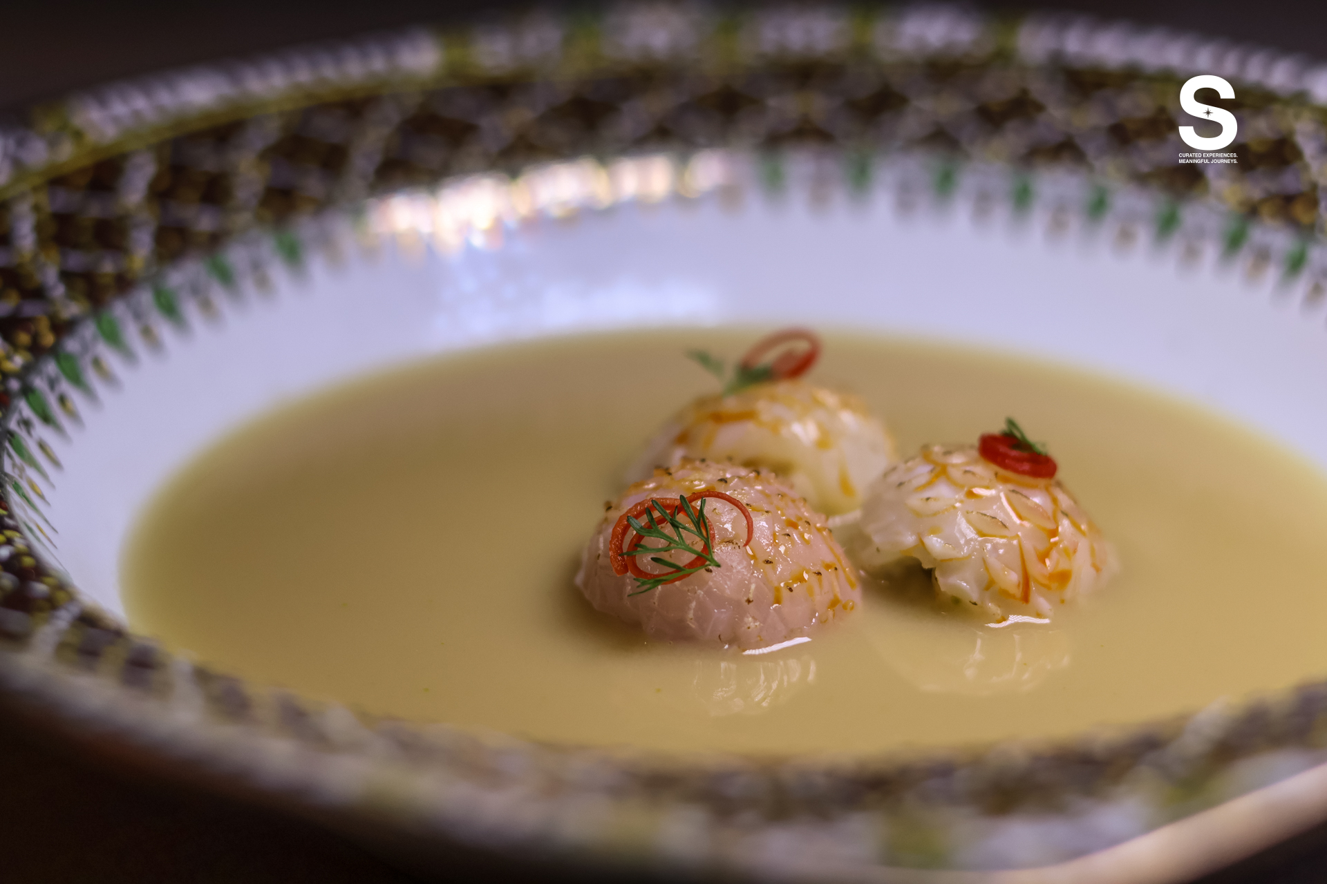 มื้ออาหารเริ่มอย่างค่อยเป็นค่อยไปด้วย ก้อยกุ้งสมุนไพรพื้นบ้าน กุ้งสดคลุกเคล้ากับสมุนไพรไทย ให้รสจัดจ้านแบบพอดี ไม่กลบรสวัตถุดิบ แต่ขับให้ความสดเด่นชัดขึ้น เสิร์ฟพร้อมข้าวเกรียบที่ทำจากเปลือกกุ้ง ซึ่งช่วยเพิ่มทั้งเนื้อสัมผัสและกลิ่นหอมอ่อน ๆ ของทะเล ก่อนจะต่อด้วย ต้มข่าปลาหมึกจากประจวบคีรีขันธ์ ซุปกะทิที่ให้ความละมุนและซับซ้อนในคำเดียว กลิ่นสมุนไพรชัด แต่ไม่หนักจนกลบรสทะเล สองจานนี้ช่วยวางโทนของมื้ออาหารได้อย่างพอดี แสดงให้เห็นว่าอาหารไทยสามารถร่วมสมัยได้ โดยยังคงตัวตนไว้อย่างครบถ้วน