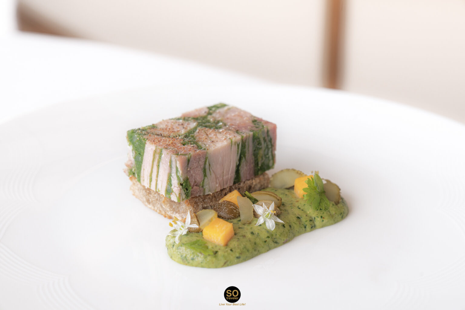 เข้าสู่โหมดของจานหลักกันบ้าง “Jambon persille” & Ravigote Condiment อาหารจานเย็นที่ทำมาจากแฮมและใบพาร์สลีย์ ด้วยรสชาติเค็มของตัวแฮม จะช่วยตัดรสชาติของใบพาร์สลีย์และเจลลี่ได้เป็นอย่างดี ถึงแม้จะเป็นอาหารจานเย็น แต่วัตถุดิบต่าง ๆ ที่คัดสรรมาอยู่ในจานนั้นเข้ากันได้อย่างไม่น่าเชื่อ เพิ่มรสชาติด้วยซอสราวิโกเต ซึ่งเป็นซอสคลาสสิกที่มีกรดเล็กน้อยในอาหารฝรั่งเศส ที่จะปรุงแบบอุ่นหรือเย็นก็ได้ สำหรับมือใหม่อย่างเรา จานนี้ถือว่าเป็นประสบการณ์ดี ๆ ที่ได้ลิ้มลองจริง ๆ