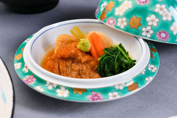 ส่วนอาหารย่างให้บริการเนื้อปลาดาบย่างแบบโฮบายากิ (Hobayaki) เสิร์ฟพร้อมเห็ดหลวงญี่ปุ่น แปะก๊วย และเกาลัด ให้บริการกับ สาเกบอร์น คานซึบากิ (BORN Kantsubaki) ส่วนเนื้อเป็ดตุ๋นกับหัวไชเท้าญี่ปุ่น มะเขือม่วงย่าง แครอทและกลีบดอกเบญจมาศ นั้น ให้บริการคู่กับ สาเกบอร์น ดรีม คัมทรู จุนไม ไดกินโจ (BORN Dreams come true Junmai-Daiginjo)