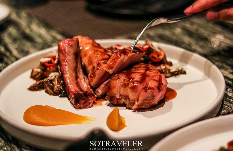 Smoked Black Angus Beef Short Rib : จานเนื้อจานนี้เชฟได้นำเอาส่วนของชอร์ทริบส์มาใช้ในการปรุง โดยเนื้อได้ถูกนำไปรมควันด้วยไม้เชวี่ก่อนเพื่อกลิ่นที่หอมและทำการเคลือบ(Glazed) ด้วยซอสโคชูจังซึ่งเป็นเครื่องปรุงท้องถิ่นของประเทศเกาหลีก่อนนำมาย่าง สำหรับจานนี้เชฟแนะนำให้ทานคู่กับมันม่วงของญี่ปุ่นซึ่งให้รสชาติหวานตัดกับรสชาติเข้มข้นของเนื้อ คอมบิเนชั่นของจานนี้ถือว่าแปลกแต่ลงตัวมากๆอย่างเหลือเชื่อจริงๆ เพราะมันม่วงนั้นถือเป็นตัวชูรสชาติชั้นดีที่ทำให้รสชาติของเนื้อโดดเด่นอยู่ในปากมากขึ้น