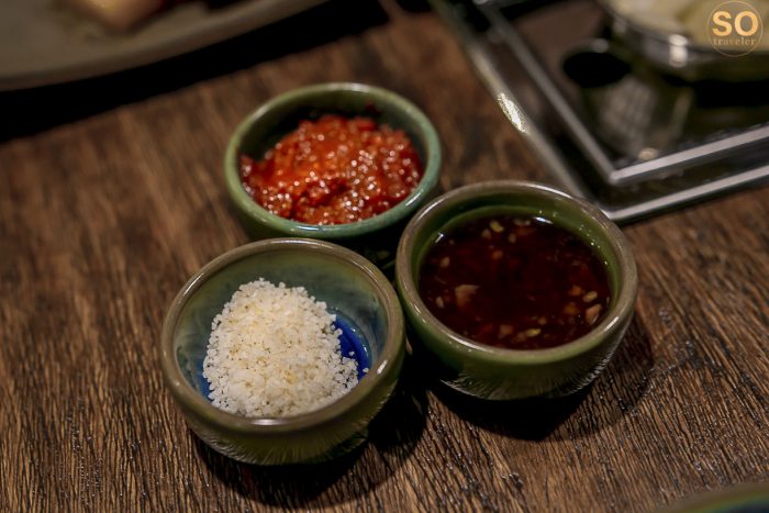 สำหรับซอสที่ได้ทำการเสิร์ฟมาให้นั้น จะมีทั้งหมด 2 อย่าง นั่นคือน้ำจิ้มที่มีส่วนผสมที่ทำมาจากเต้าเจี้ยวทำให้มีรสชาติที่เค็มแต่ละมุน กับน้ำจิ้มที่มีส่วนผสมมาจากพริกกิมจิหรือพริกโคชูจางนั่นเอง ที่จะให้รสชาติที่ออกไปทางหวานนิดๆและมีกลิ่นของพริกกิมจิเล็กน้อย ซึ่งเป็นหนึ่งในน้ำจิ้มที่ได้รับความนิยม ควบคู่กับเกลือญี่ปุ่น ที่ถูกเสิร์ฟมาพร้อมกับน้ำจิ้มทั้ง 2 อย่างนี้ โดยที่ลูกค้าส่วนใหญ่มักจะจิ้ม พริกกิมจิ และ เกลือญี่ปุ่น คู่กันกับเนื้อ เพราะจะทำให้มีรสชาติ หวานๆและได้กลิ่นกลิ่นหอมของพริกกิมจิ ที่ช่วยชูรสชาติของกลิ่นเนื้อขึ้นมา โดยที่มีความเค็มของตัวเกลือญี่ปุ่นคอยตัดเอาไว้อยู่