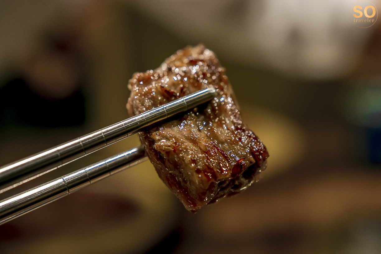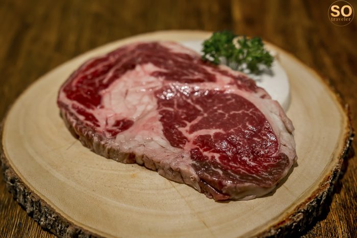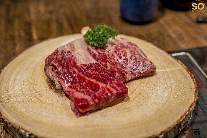 ต่อกันที่ Rib Eye ที่ถึงแม้ว่าตัวเนื้อนั้น จะมีกลิ่นของเนื้อที่ออกมาน้อยกว่า Wagyu แต่ ต้องยอมรับว่า ตัวเนื้อ Rib eye ของที่นี่นั้น จะมีความนุ่มและหนึบ แต่ก็ยังมีความละมุนอย่างมากเช่นกัน ซึ่งหากรับประทานพร้อมกับผัก น้ำจิ้มพริกกิมจิ และเกลือญี่ปุ่น จะทำให้รสชาติกลมกล่อมเข้ากันและครบรสอย่างมาก โดยส่วนของRib eye นั้น เป็นหนึ่งในส่วนที่ขายดีที่สุดของร้านเลยด้วย