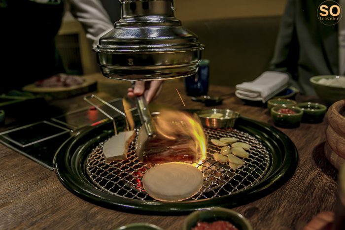 แรกเริ่มสุดนั้น ทางพนักงานจะนำกระเทียม ไปปิ้งบนเตาถ่านก่อนเพื่อให้กลิ่นของกระเทียมนั้นซึมซับเข้าสู่ส่วนอื่นๆที่จะปิ้งต่อหลังจากนั้น ตามด้วย เนื้อซึ่งทางพนักงานนั้น จะตัดส่วนติดมันของเนื้อมาปิ้งก่อน ก่อนที่จะนำเนื้อติดมันส่วนนั้น มาละเลงลงบนเนื้อที่กำลังปิ้ง เพื่อให้เกิดกลิ่นที่หอม หวาน และ มัน มากขึ้นบนตัวเนื้อ ซึ่งลูกค้าส่วนใหญ่ก็มักจะรับประทานคู่กับน้ำจิ้มพริกกิมจิ และ เกลือญี่ปุ่นครับ