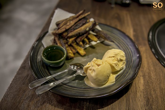 ในส่วนไอศกรีมวานิลลา เราขอพูดไปพร้อมกับอีกหนึ่งเมนูที่ถูกจัดมาให้พร้อมกัน นั่นคือ ไอศกรีมวานิลาเสิร์ฟพร้อมกับมันม่วงทอด ที่ดูเหมือนจะไม่เข้ากัน แต่ด้วยเนื้อของไอศกรีมที่มีความเนียนและมีเกร็ดน้ำแข็งผสมอยู่ด้วย มันช่วยสร้างความละมุนและเติมเต็มรสสัมผัสของมันให้เชื่อมกันได้อย่างพอดี โดยกลิ่นของน้ำผึ้งที่ถูกเสิร์ฟมาพร้อมกันในจานที่ถูกตกแต่งมาอย่างสวยงาม
