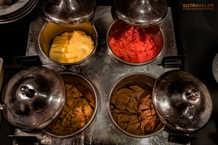 มีให้เลือกถึง 4 รสชาติ วนิลลา, สตรอเบอร์รี่, กาแฟ, ช็อคโกแล็ต รสชาติเข้มข้น พร้อมกับท๊อปปิ้งหลากหลายอย่าง และมีโคนไอศกรีมให้เลือกทานกันด้วย