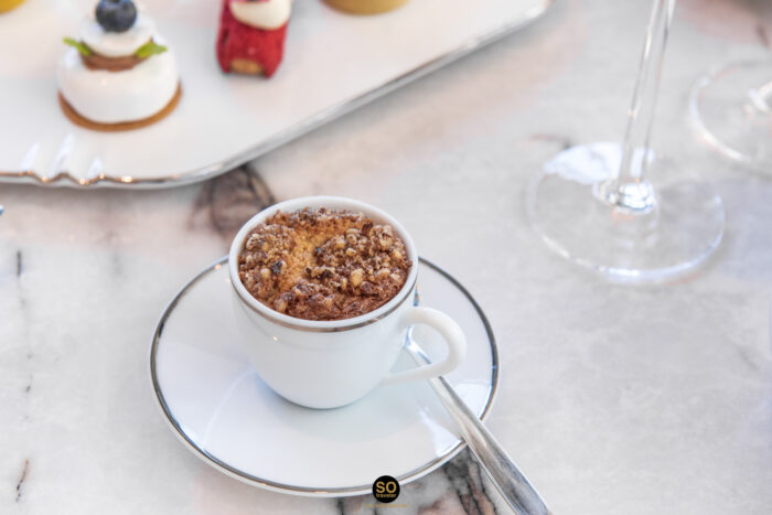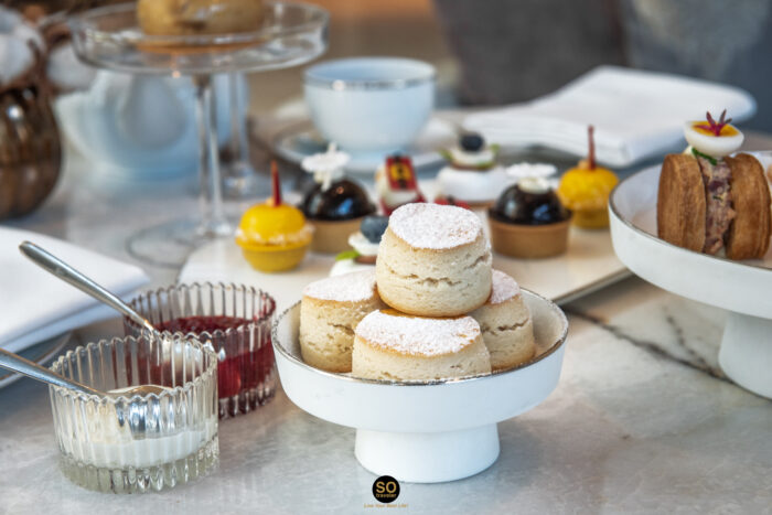 Prepare your taste buds for a journey through the sublime as you delve into the hand-crafted pastries that adorn the tiered stands. The 70% Dark Chocolate Mousse, Orange Compote & Star Anise Tart tantalizes with its rich, velvety texture and the intriguing warmth of star anise. The Hazelnut Financier, Pear Compote, Yuzu Cream offers a delicate balance of nuttiness and citrusy brightness, while the Chestnut & Hennessy Cognac Cream, Blackcurrant Gel, White Chocolate Whip Ganache unveils a harmonious blend of indulgence.