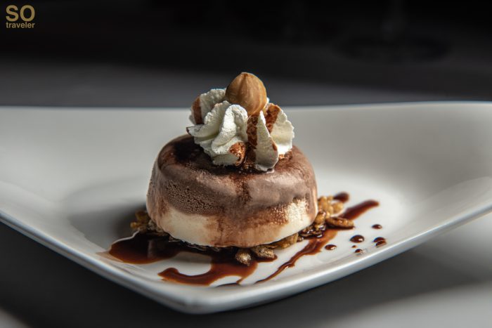 Hazelnut and Chocolate ice cream, Chocolate sauce.