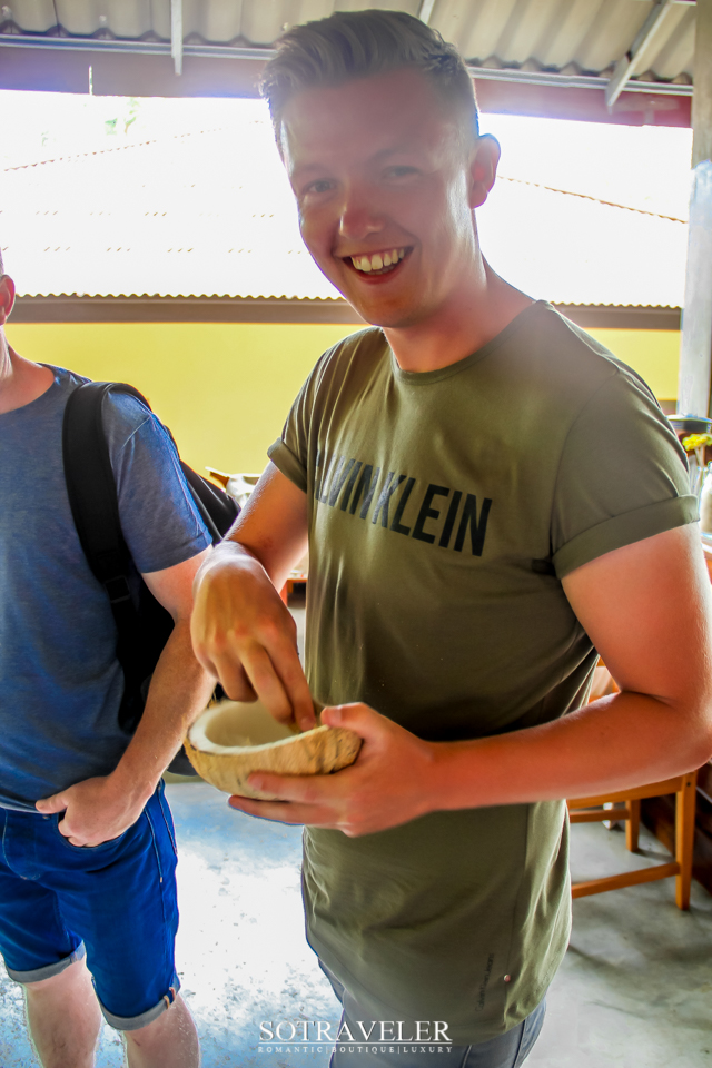 การ ‘Discovery’ ของพวกเราทวีความเข้มข้นขึ้นเรื่อยๆ ที่จุดถัดไปคือ บ้านมะพร้าว หรือ ‘Coconut Museum’ ที่เปิดโอกาสให้พวกเราเดินเข้ามาในบ้านกลางสวนมะพร้าว ที่เจ้าของบ้านกินอยู่หลับนอนทำงานตรงนี้จริงๆ และยังสละเวลามาให้ความรู้กับพวกเรา วันนี้เพิ่งจะรู้ว่ามะพร้าวหนึ่งลูกมีคุณประโยชน์ยิ่งกว่า Swiss Army Knife เป็นร้อยๆเท่า ภูมิปัญญาชาวบ้านไทยสามารถพลิกแพลงมะพร้าวลูกเดียวใช้ได้ตั้งแต่ เครื่องราง เครื่องดนตรี เครื่องนวดเท้า และอื่นๆอีกมากมาย