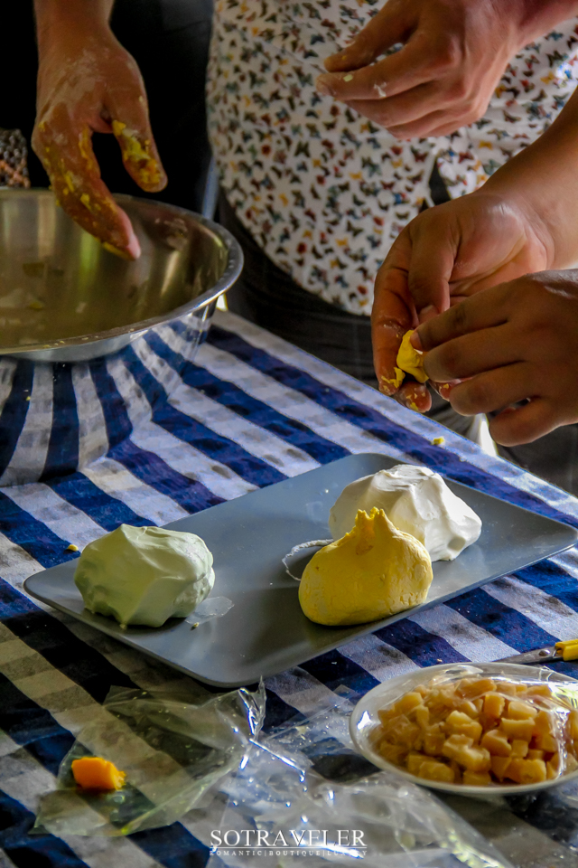 ที่นี่พวกเราต้องลงมือนวดแป้ง ช่วยกันทำ ‘ขนมโค’ซึ่งเป็นขนมท้องถิ่นของสมุย ซึ่งเกิดมาก็เพิ่งจะรู้จักวันนี้เอง ครัวขนมของเราวันนี้มีความนานาชาติไม่แพ้การแข่งฟุตบอลโลก เลยทีเดียว คุณลุงปีเตอร์ แขกชาวเยอรมันท่านหนึ่ง จับคู่นวดแป้งกับน้องซูกี้ ซึ่งเป็นหนึ่งในทีมงานชาวดัชท์ของเรอเนสซองต์ ทีมชาติไทยก็ส่งตัวแทนเข้าร่วมกิจกรรมปั้นขนมด้วย
