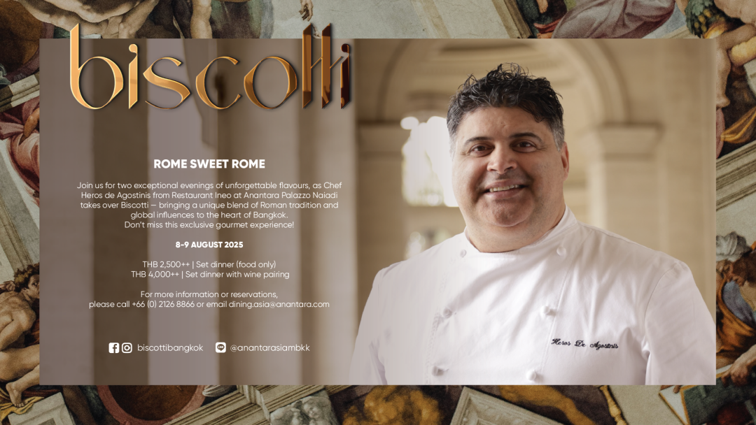 ห้องอาหารบิสก็อตติ (Biscotti) ร้านอาหารอิตาเลียนระดับตำนานกว่า 40 ปี ที่โรงแรมอนันตรา สยาม กรุงเทพฯ ร่วมกับเชฟ Heros de Agostinis (เชฟเฮรอส เด อากอสตินิส) หัวหน้าเชฟจากร้าน INEO โรงแรมอนันตรา ปาลาซโซ นายาดี โรม ประเทศอิตาลี บินลัดฟ้ามารังสรรค์มื้อพิเศษต้อนรับวันแม่ตลอดหนึ่งสัปดาห์เต็ม พร้อมเชิญชวนนักชิมร่วมเดินทางไปสัมผัสกับรสชาติอาหารอิตาเลียนชั้นเลิศระดับมิชลินไกด์