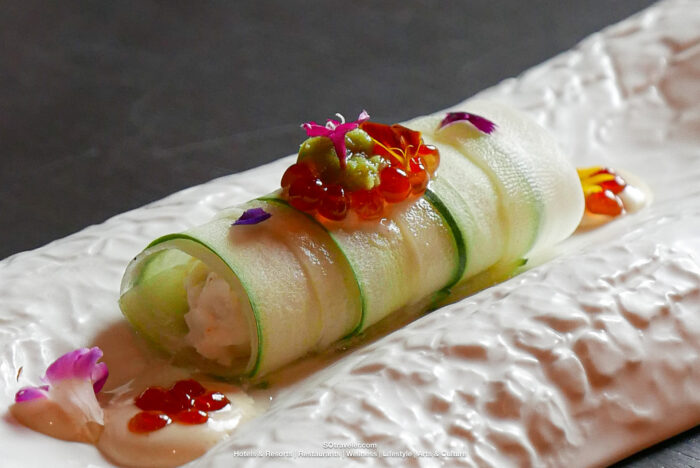 ตัวอย่างเมนูที่ทางเชฟได้รังสรรค์ขึ้น อาทิเช่น King Crab Timbale ปูยักษ์อลาสก้าผสมกับรสชาติแบบญี่ปุ่น เสริม