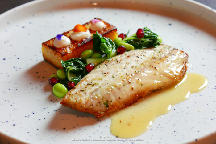 Butter Baked Seabass จานนี้ชูรสชาติความสดของปลากะพงพร้อมเพิ่มรสชาติ และความหอมด้วยเนย พร้อมเคียงด้วยดอกกะหล่ำ ย็อคคีมันฝรั่ง เบอเร บลอง และทับทิม