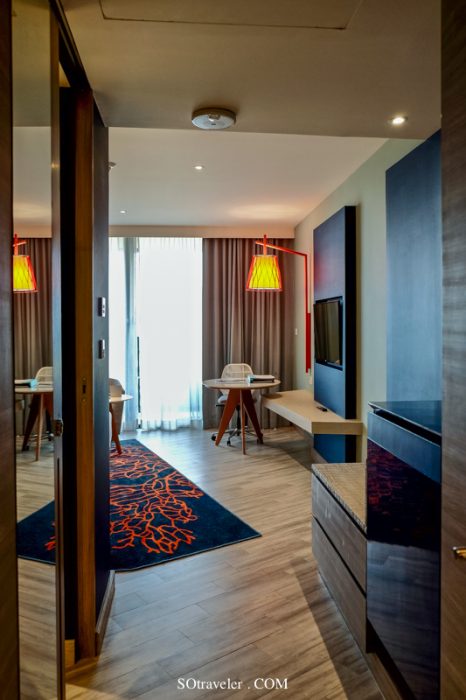 สำหรับห้อง Ocean view เป็นห้องขนาดกำลังพอดี ที่ 39 ตร.ม. โดยในห้องก็มีอุปกรณ์พื้นฐานครบครันครับ รวมถึงโต๊ะรีดผ้าและเตารีด เหมาะสำหรับการมาท่องเที่ยวเชิงธุรกิจ โดยการตกแต่งก็จะเน้นเป็น theme ของ ”หมู่บ้านชาวประมง” อันเป็นการให้เกรียติต่อเรื่องราวของพื้นที่้ซึ่งในอดีตเป็นหมู่บ้านที่ใช้วิถีชีวิตแบบชาวประมง