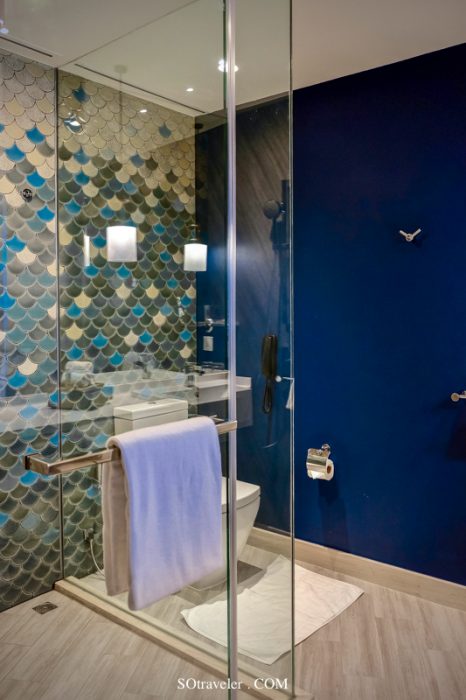 ห้องน้ำที่นี่พิเศษตรงที่สามารถเปิด partition กั้นออกเพื่อมองผ่านห้องนอนไปยังวิวทะเลได้เลยครับ โดยยังคุม concept เป็นเกล็ดปลาและสีสันแห่งท้องทะเลอยู่