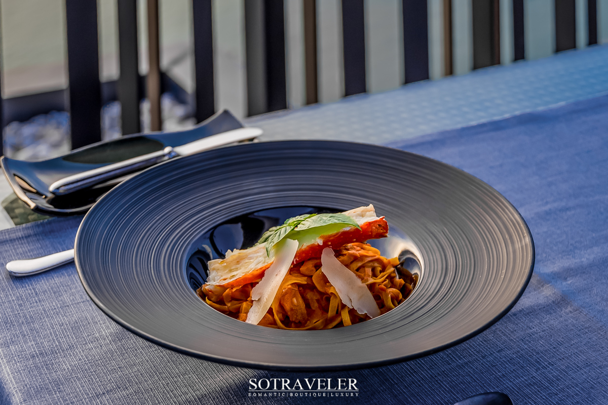 พาสต้าทาญเลียเตลเลกับปูอลาสก้า (King Crab Tagliatelle) เมนูนี้เลือกใช้พาสตาร์เส้นแบนใหญ่ที่เรียกว่าทาญเลียเตลเลผัดกับซอสมะเขือเทศที่มีการเพิ่มรสชาติด้วยการใส่พริกลงไปด้วย หลักๆแล้วเมนูนี้เน้นชูรสชาติของปูอลาสก้าออกมา และที่สำคัญเส้นพาสตาร์เหนียวนุ่มมาก