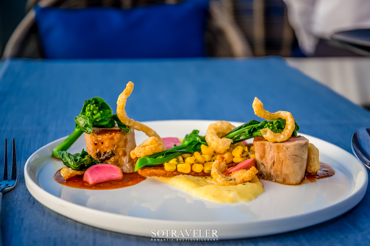 หมูดำคุโรบุตะ (Kurobuta Pork ) เนื้อหมูดำคุโรบุตาส่วนสันในตุ๋นกับโพเลนต้าเสิร์ฟคู่กับข้าวโพดหวานและหัวไชเท้าดอง คุโรบุตาเนื้อนุ่ม ชิ้นหนาดี ได้รสหมูตุ๋น