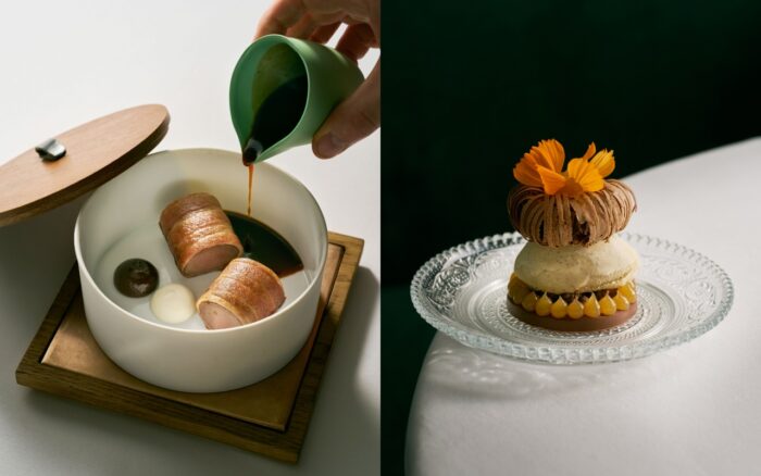 จานไฮไลต์ประจำเมนูฤดูหนาว เริ่มต้นด้วยของว่าง อาทิ ปลากระพง—ใบยี่หร่า—หัวไชเท้า และ เห็ดหูหนูขาว—ดาชิ—ทรัฟเฟิล อาหารเรียกน้ำย่อยคอร์สแรกมอบความสดชื่นด้วย ปลาเทราต์—ขมิ้นขาว—พริกแห้ง เราเลือกใช้ปลาเรนโบว์เทราต์ของมูลนิธิโครงการหลวง จังหวัดเชียงใหม่ รวมไปถึงจาน ปลาคัมพาจิ—กระเทียมต้น—มะเฟือง ในส่วนของอาหารเรียกน้ำย่อยคอร์สที่สอง มีบีทรูทเป็นวัตถุดิบหลัก ได้แก่ ทาร์ทาร์เนื้อลูกวัว—บีทรูท—หัวหอม, หางวัว—บีทรูท และ สวีทเบรด—บีทรูท—พริกแกงเขียวหวาน