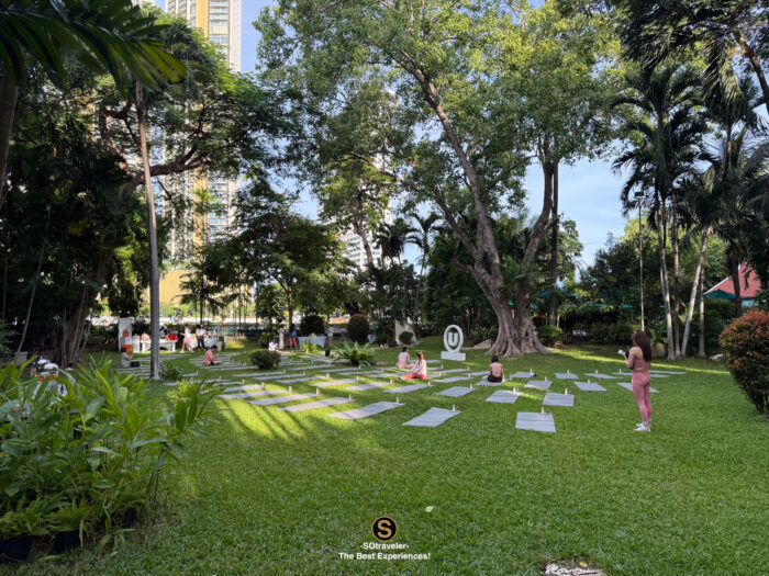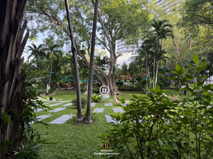 ตั้งแต่ก้าวแรกที่เดินเข้ามายังพื้นที่ริมแม่น้ำเจ้าพระยา บรรยากาศช่างสงบและร่มรื่น ทุกอย่างถูกจัดเตรียมไว้อย่างประณีต เสื่อโยคะถูกวางเรียงรายท่ามกลางสีเขียวของต้นไม้ เสียงลมพัดแผ่วเบาและเสียงนกประสานกันราวกับธรรมชาติกำลังต้อนรับผู้เข้าร่วมงานให้ผ่อนคลายจากความวุ่นวายในเมืองใหญ่