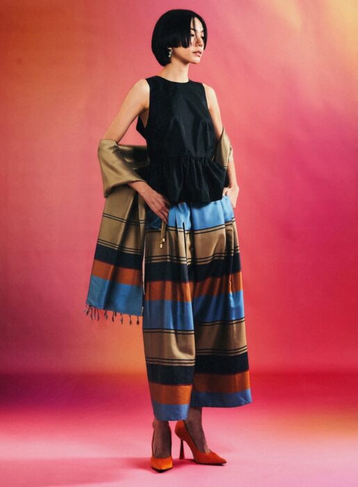 The collection derives from the brand’s long-term collaboration with Thai silk artisans, reinterpreting the traditional ‘Pakaoma’ stripes and showcasing the original pattern through four signature pieces: women’s fisherman pants, handwoven silk scarves, men’s pocket squares, and neckties. The contemporary fashionwear range presents four distinctive patterns and four colorways – Pakaoma Rose Pink, Border Stripes Blue, Horizontal Stripes Beige, and Border Stripes Pink– each highlighting the exceptional craftsmanship of the Baan Krua community.
