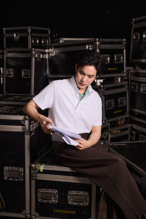 Looking relaxed and smart in front of the camera, but prepped and ready for a demanding day behind the scenes, Vasin “Ko” Asvanarunat looks the complete professionalin a white Mandarin Polo with feature cravat at Workpoint Entertainment Studios.“It’s the subtle design touches that really stand out on screen, such as the intricate detailing of the unique silk collar piping,” Ko remarked between takes.