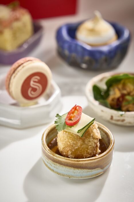 ‘Jim’s Mystery Box Grand Tea Experience’ begins with a curated selection of savory creations. Blue swimmer crab is paired with creamy Thai chili paste mayo in the Crab & Chili Bliss open sandwich, while slow-cooked Thai Kurobuta pork is layered with a sweet and aromatic spice blend inside a brioche to form the Pulled Pork Harmony Sandwiches. The Chicken Satay Ball reimagines the Thai street food favorite as a golden-fried croquette, served with a traditional cucumber and chili relish. Miang Khum Pla Yarng rounds out the savory section with grilled fish of the day on betel leaves topped with a tangy herbal dressing and cashew nuts.