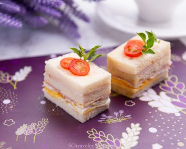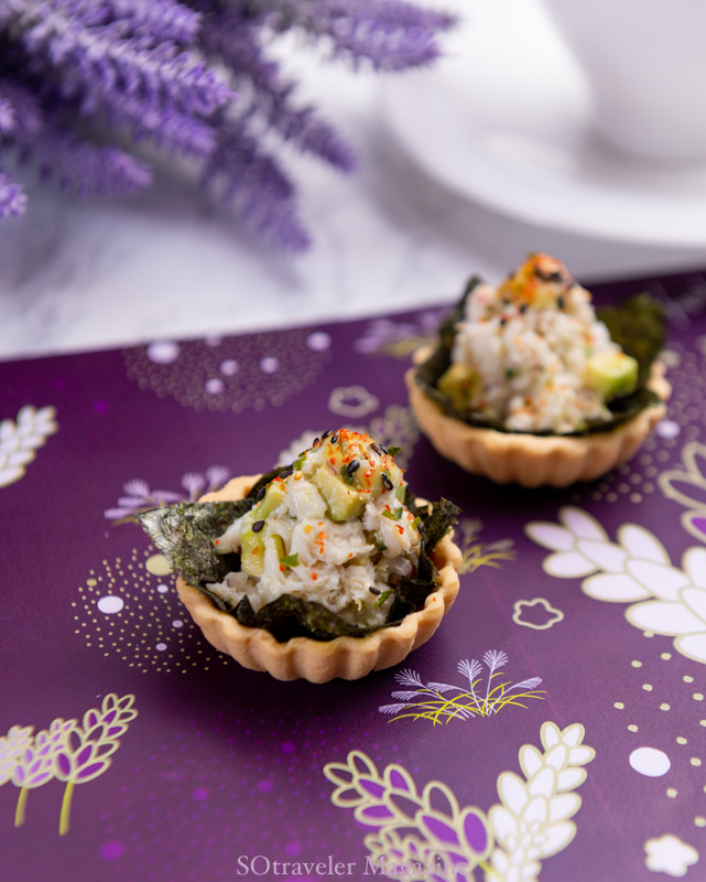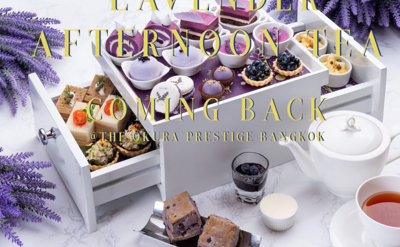 ชุดน้ำชายามบ่ายลาเวนเดอร์ ประกอบไปด้วย ของหวานและของคาวทั้งหมด 12 รายการ ที่ผสมผสานรายการของคาวหวานทั้งแบบฝรั่งและญี่ปุ่น ได้อย่างลงตัว เริ่มจากขนมหวาน อาทิ เค้กลาเวนเดอร์สลับชั้นกับเยลลี่แบล็คเคอร์แรนท์และมูสไวท์ช็อกโกแลต ไดฟูกุไส้มันม่วง ช็อกโกแลตทรัฟเฟิลไส้เกสรผึ้ง (Bee Pollen) วุ้นญี่ปุ่นกลิ่นลาเวนเดอร์วางบนพุดดิ้งนมฮอกไกโด สโคนสีม่วงแต่งด้วยแบล็คเคอร์แรนท์อบแห้ง และขนมหวานที่ขาดไม่ได้ คือ มาการองพิมพ์ลายดอกลาเวนเดอร์ไส้แบล็คเคอร์แรนท์ ส่วนรายการของคาว ได้แก่ ทาร์ตสาหร่ายญี่ปุ่นสลัดเนื้อปูและอะโวคาโด้ หน่อไม้ฝรั่งขาวราดซอสฮอลแลนด์เดส (Hollandaise) และเคเปอร์ (Caper) คลับแซนวิชแบบพอดีคำ แซนวิชขนมปังไรย์ไส้ปลาเทร้ารมควันและแตงกวาผสมฮอร์สแรดิช (Horse radish)