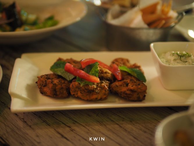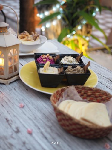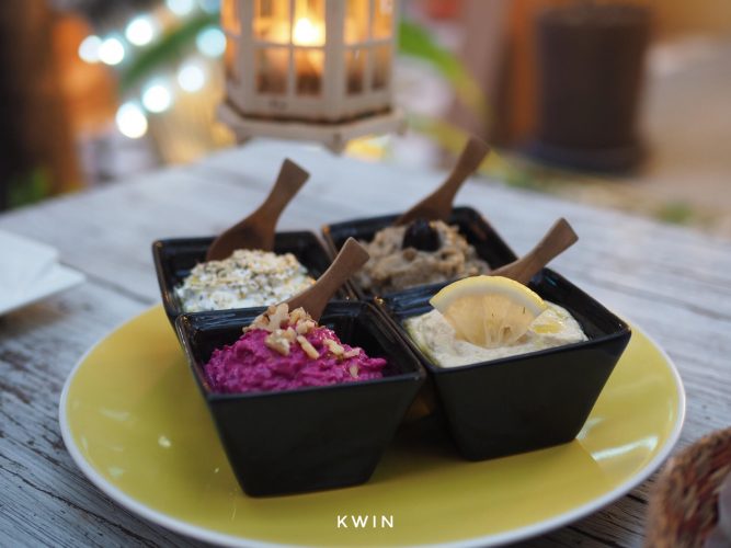 – Labneh – Greek Yogurt with Lime and Herbs ดิปสไตล์อารบิกซึ่งใช้วัตถุดิบคือกรีกโยเกิร์ตล้วนๆ นำมาดึงน้ำออกในตู้เย็นจนข้นมากถึงมากที่สุด ปรุงด้วยน้ำมะนาวและสมุนไพรที่ให้กลิ่นสดชื่นก่อนเสิร์ฟโรยงาซึ่งทำให้การกินได้สัมผัสถึง Texture ที่ลงตัว