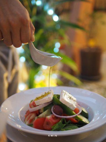 พระเอกของงานคงต้องบอกว่าคือสลัดจานนี้ เพราะสื่อสารถึงวัฒนธรรมการกินของผู้คนแถบเมดดิเตอร์เรเนียนได้อย่างดี กับวัตถุดิบหลักๆที่หั่นมาเป็นชิ้นใหญ่พอดีคำตามแบบท้องถิ่น ส่วนประกอบหลักของสลัดจานนี้ คือ แตงกวา มะเขือเทศ หัวหอม(ซึ่งใช้หัวหอมแดงเพื่อให้ผสมผสานสไตล์ไทยด้วย) และที่ขาดไม่ได้ นั่นคือโอลีฟ(เหมือนชื่อร้าน)ซึ่งนำเข้ามาจากแหล่งขึ้นชื่อ และสุดท้ายโรยด้วยทาลามัตตาหรือ ชีสไสลด์ซึ่งทำจากนมแพะ