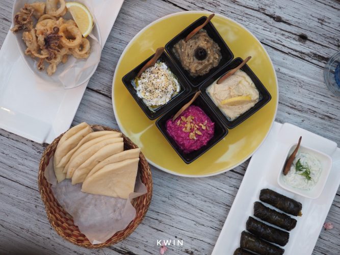 เมื่อกล่าวถึงดิปหลากหลายชนิดที่ถูกเสิร์ฟ ดิปอีกตัวหนึ่งที่ถูกเสิร์ฟคู่กับอาหารจานหลักในหลายเมนูคือดิปที่เรียกว่า Tzatziki – Greek Yogurt & Cucumber Dip รสชาติและความสดชื่นของแตงกวาทำให้กินได้ต่อเนื่องไม่เบื่อ น้ำซึ่งเป็นส่วนประกอบหลักทำให้ทุกครั้งที่เคี้ยวดิปนี้ล้วนๆหรือปนกับอาหารสักคำจากเมนูอื่นนั้นเป็นการสอดประสานที่ลงตัวและแทบจะต้องตักซ้ำในทันที พอเริ่มเฟรชจากเมนูดิปมากมาย เราก็พร้อมเดินทางเข้าสู่จุดเริ่มต้นของร้านอาหารกรีกที่เสิร์ฟด้วยใจ ดีไซน์จากวัตถุดิบแท้จากท้องถิ่น