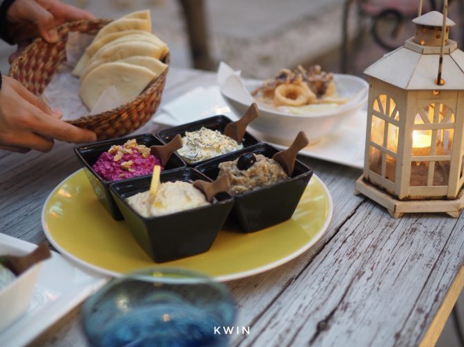 – Patzarosalata – Beetroot & Yogurt Dip with walnut สีแดงม่วงของบีทรูททำให้เดาถึงวัตถุดิบหลักได้ไม่ยาก แต่หากไม่ได้ตักเนื้อดิปขึ้นมาสัมผัสบนลิ้นคงไม่ทราบว่ามีส่วนประกอบของกรีกโยเกิร์ตซึ่งกรองเอาน้ำออกจนหมดผสมอยู่ ประกอบกับกลิ่นของวอลนัทที่เข้ากันอย่างลงตัว ทำให้ดิปถ้วยนี้น่าสนใจมากเลยทีเดียว