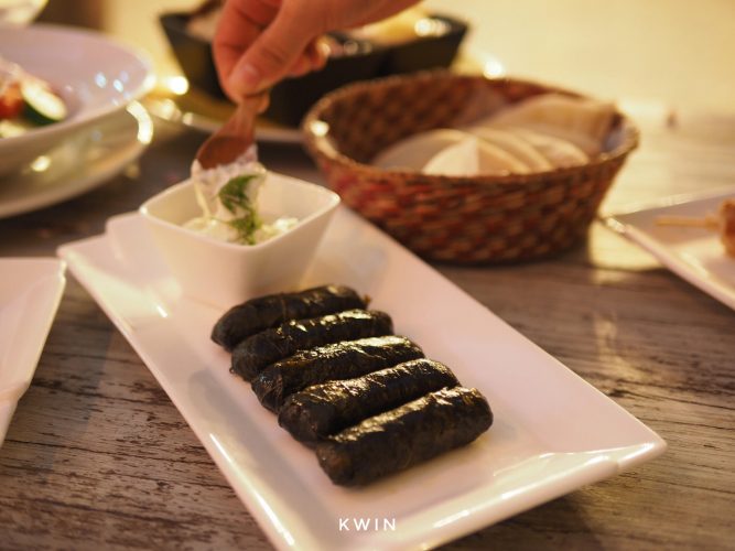 หากมองด้วยตาคงสงสัยว่าจานนี้คือใบพืชชนิดใดซึ่งม้วนตัวอยู่ อันที่จริงมันคือใบองุ่นซึ่งโอบรัดก้อนข้าวซึ่งหุงนึ่งกับสมุนไพร กลิ่นหอมจึงไม่อาจถูกขัดขวางไว้ภายในใบองุ่นที่ม้วนได้ หากกัดลงไปจะสัมผัสถึงความนุ่มและร่วนพอดีของข้าวรสชาติอมเปรี้ยวนิดๆของน้ำเลม่อนก็ตัดกันให้เลือกตักชิ้นต่อไปได้ไม่เบื่อ