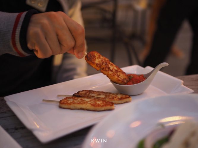 สาวกชีสทั้งหลายคงถูกใจกับจานนี้ ชีสย่างร้อนๆหอมกรุ่น ใช่แล้วๆ ชีสที่ถูกนำมาย่างแต่ยังคงเป็นชิ้นหนึบ ไม่เหลวเละ ทางร้านใช้ชีสของแท้จากไซปรัสจึงทำให้ย่างได้โดยคงรูปเป็นก้อนแข็งอยู่ เสิร์ฟคู่กับดิปพริกหวานผัดซอสมะเขือเทศก็ให้ความรู้สึกลงตัวดี