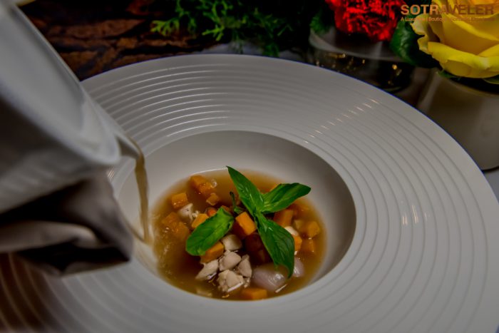 คอร์สที่ 3 ต้มจิ๋วไก่ตะนาวศรี เมนูอาหารไทยโบราณที่มีลักษณะคล้ายต้มแซ่บแต่ไม่ใส่เครื่องต้มยำ จัดเสิร์ฟมาในชามที่มีแครอท หอมแดง และไก่บ้านตะนาวศรีที่มีเนื้ออร่อยไขมันต่ำ พร้อมกับราดน้ำซุปตามลงไป น้ำซุปกลิ่นหอมรสชาติเปรี้ยว เค็ม หวาน กลมกล่อมกำลังพอดี