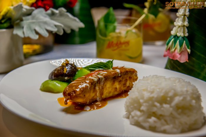 คอร์สที่ 4 ฉู่ฉี่ปลากะพงกับข้าวหอมมะลิ เสิร์ฟพร้อมกับค็อกเทล Mekhong Thai Sabai ที่มีส่วนผสมของ Mekhong, น้ำมะนาวสด, ไซรัป, ใบโหระพาไทย, โซดาสแปลช