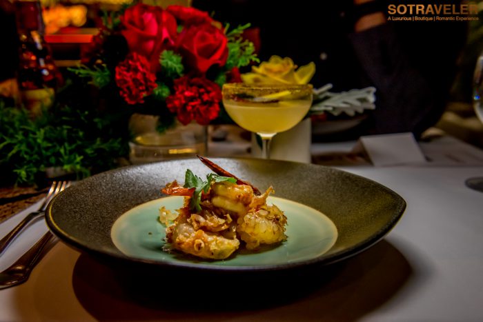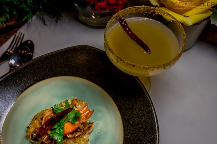เริ่มต้นเข้าสู่คอร์สที่ 1 ยำส้มโอขาวน้ำผึ้งกับกุ้งเสียบ เสิร์ฟพร้อมกับค็อกเทล Thai Margarita ที่มีส่วนผสมของ Mekhong, เตกีล่า, เสาวรสสด, น้ำมะนาว, ไซรัป, พริกคั่ว และเคลือบขอบแก้วไทยมาร์การิต้านี้ด้วยพริกเกลือโบราณ