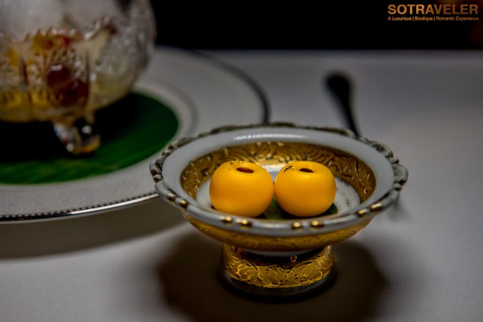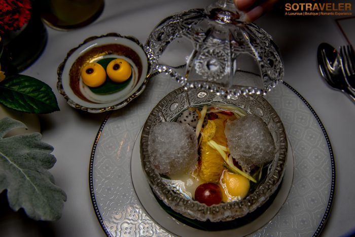 ปิดท้ายด้วยคอร์สของหวานคอร์สที่ 5 ส้มฉุน กับเสน่ห์จันทน์ ส้มฉุนขนมโบราณตระกูลลอยแก้วที่หาทานได้ยากในสมัยนี้ เวลาทานต้องคนให้เข้ากันเพื่อให้น้ำเชื่อมที่มีส่วนผสมของส้มซ่านั้นผสมอยู่ในทุกคำที่ตักทาน ผลไม้มีทั้งส้ม องุ่น ทับทิม ลิ้นจี่ เงาะ ตักเข้าปากแล้วจะสัมผัสได้ถึงความหวานและกลิ่นหอมจากส้มซ่า หอมแดงเจียว และขิง พร้อมกับเสิร์ฟขนม ‘เสน่ห์จันทน์’ ขนมที่ได้แรงบันดาลใจมาจาก ‘ลูกจันทร์’ ผลไม้พื้นบ้านที่มีผลสุกสีเหลืองเปล่งปลั่ง มีกลิ่นหอมชวนหลงไหล ทำจากถั่วเขียวผสมผลจันทร์บดเพื่อเพิ่มกลิ่นหอม ก่อนอบด้วยเทียนหอมที่ทางร้านทำขึ้นมาเอง