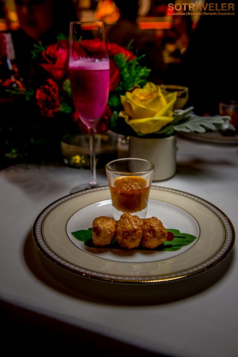คอร์สที่ 2 ลูกชิ้นกุ้งกับซอสมันกุ้งเสิร์ฟพร้อมกับค็อกเทล Ruby of Siam ที่มีส่วนผสมของ Mekhong, แก้วมังกรแดง, เสาวรส, อินฟิวส์บิตเตอร์ระหว่างมะนาวกับออเร้นท์ บิตเตอร์, ไซรัปกลิ่นมะลิ, ไข่ขาว และส้มซ่าขูดท็อปด้านบนของแก้วให้ความสดชื่น