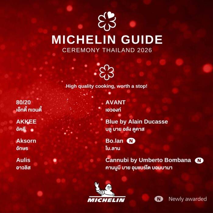 ในงานเปิดตัวคู่มือ ‘มิชลิน ไกด์’ ฉบับประเทศไทย ประจำปี 2569 (The MICHELIN Guide Thailand 2026) มิชลินได้ประกาศรายชื่อร้านอาหารที่คว้ารางวัล ‘ดาวมิชลิน’ และรางวัลพิเศษอื่น ๆ โดยคู่มือฉบับนี้บรรจุรายชื่อร้านอาหารที่ผ่านการคัดสรรรวมทั้งสิ้น 468 แห่ง เป็นร้านที่ได้รับรางวัล ‘สามดาวมิชลิน’ 2 ร้าน (เลื่อนระดับจาก ‘สองดาวมิชลิน’ 1 ร้าน), ‘สองดาวมิชลิน’ 8 ร้าน (เลื่อนระดับจาก ‘หนึ่งดาวมิชลิน’ 2 ร้าน), รางวัล ‘หนึ่งดาวมิชลิน’ 33 ร้าน (ติดอันดับครั้งแรก 3 ร้าน และเลื่อนระดับจาก MICHELIN Selected 4 ร้าน), รางวัล ‘บิบ กูร์มองด์’ 137 ร้าน (ติดอันดับครั้งแรก 13 ร้าน) และร้านแนะนำ หรือ MICHELIN Selected อีก 288 ร้าน (ติดอันดับครั้งแรก 50 ร้าน)