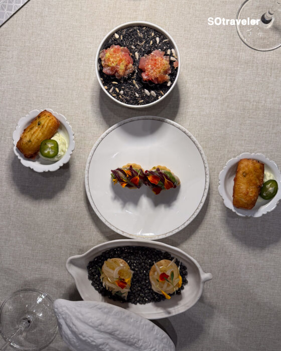 เป็นค่ำคืนที่สะท้อนความงดงามของสองวัฒนธรรม ผ่านภาษาของ “รสชาติ” และ “เทคนิค” ที่เปี่ยมด้วยศิลปะ เริ่มต้นด้วย Champagne Canapés ที่เปิดเกมอย่างหรูหรา Tuna Tartelette จากเชฟ Charles ให้สัมผัสละเมียดละไมของปลาทูน่าสด ผสานกับ Confit Lamb Belly ที่เพิ่มความเข้มข้นและกลิ่นหอมลึกของเนื้อในคำเดียว ขณะที่ Churros Jalapeños ของเชฟ Enrique ปลุกประสาทรับรสด้วยความเผ็ดเปรี้ยวจาก Acidulated Vegetable Tartelette คำเล็ก ๆ ที่ทั้งสนุกและเฉียบคมในเวลาเดียวกัน