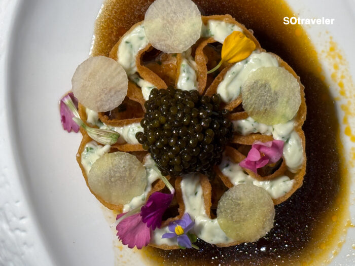 อีกจานที่น่าจดจำคือ Crab Buñuelos ของเชฟ Enrique เนื้อปูทอดกรอบหอมมัน เสิร์ฟคู่กับมะม่วงและมะละกอเขียวที่ให้ความสดชื่น เติมมิติรสชาติด้วยน้ำซุปใส (Bouillon) และ Salsa Macha เผ็ดร้อนสไตล์เม็กซิกันที่ช่วยให้จานนี้ทั้งสดใสและทรงพลัง