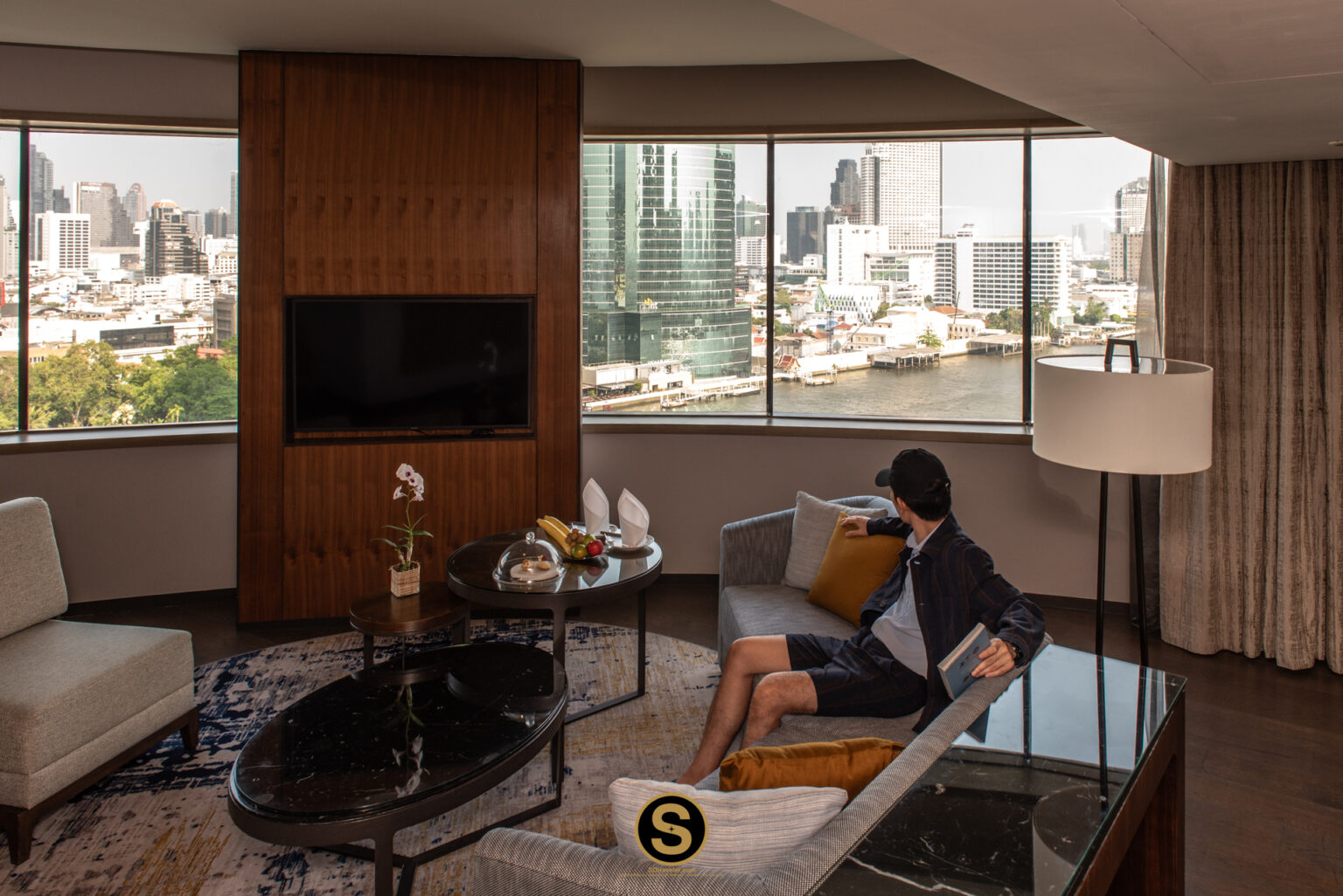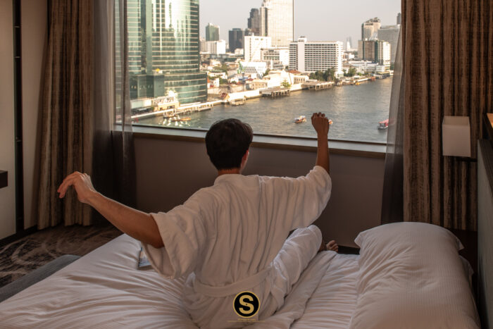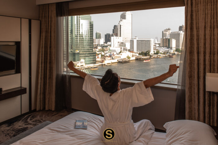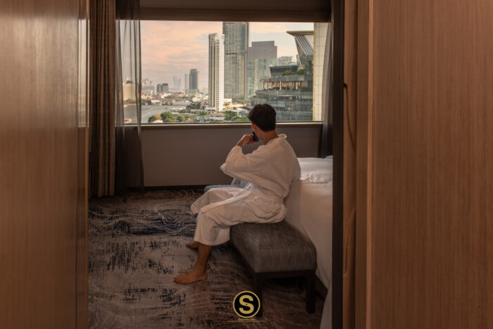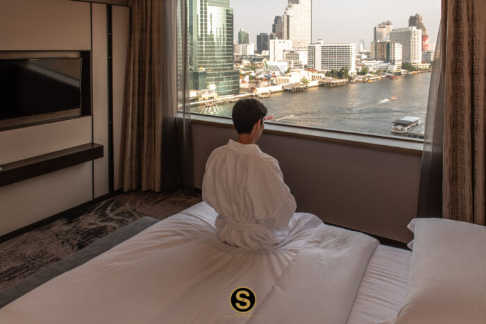 หลังจากที่ขึ้นไปเช็คอินที่ Executive Lounge ชั้น 31 เรียบร้อยแล้ว เราขอชวนคุณมาดูในส่วนของห้อง Panoramic Executive Suite กันต่อ ห้องพักตกแต่งในโทนสีน้ำตาลไม้ เน้นความเรียบหรู พร้อมวิวจากหน้าต่างกระจกแบบมุมกว้างให้ความรู้สึกโปร่งสบาย มองเห็นวิวเมืองและแม่น้ำเจ้าพระยาสบายตา