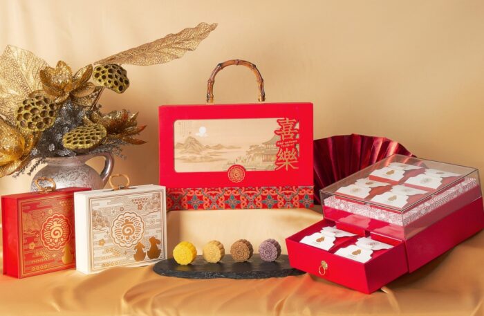 กล่องดีไซน์ร่วมสมัยสีแดงอมชมพู ตกแต่งด้วยลายฉลุอันงดงาม ภายในคือ Mooncake รสคลาสสิก เช่น คัสตาร์ด, เม็ดบัวไข่แดงเค็ม, ทุเรียน และรสร่วมสมัย ชาเอิร์ลเกรย์แมคคาเดเมีย