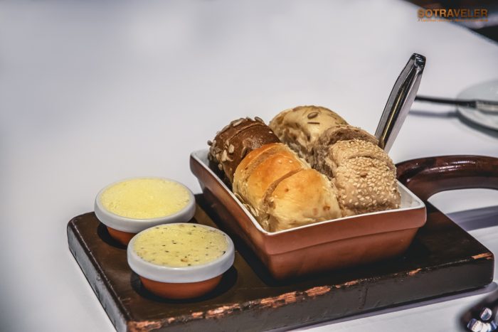 เริ่มต้นกันด้วยขนมปังคอมพลิเมนทารี่สี่รสชาติ เสิร์ฟพร้อมเนยแบบธรรมดา และ เนยกระเทียม เสิร์ฟในขณะที่ยังอุ่นร้อนเหมือนออกจากเตาใหม่ ๆ