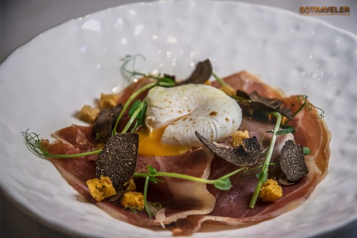 เมนูต่อมาเราอยากชวนชิมเห็ดทรัฟเฟิลดำจากประเทศอิตาลี กับ เมนูเห็ดทรัฟเฟิลดำ เสิร์ฟพร้อมโพชเอ้กและพาร์มาแฮม กลิ่นของทรัฟเฟิลส่งกลิ่นหอมยั่วยวลจมูกตั้งแต่ยกมาเสิร์ฟที่โต๊ะ ทานคู่กันโพชเอ้กที่ให้ความหวานนุ่มกับพาร์มาแฮมรสออกเค็มนิด ๆ เป็นความอร่อยที่เข้ากันได้ดี