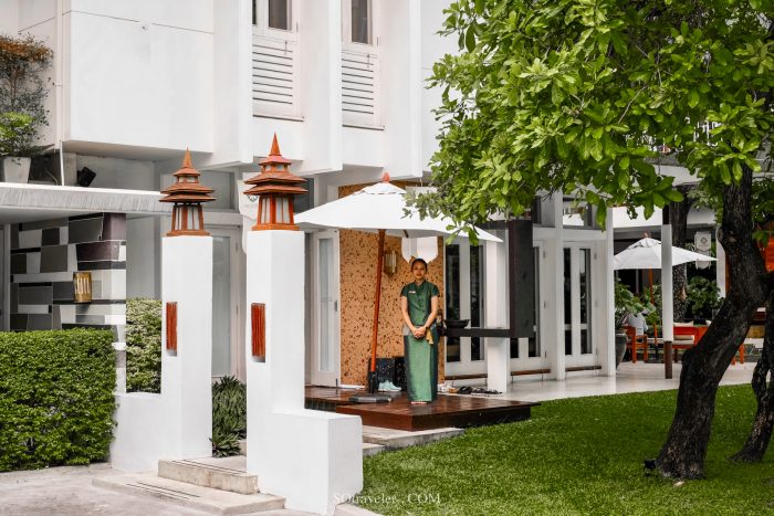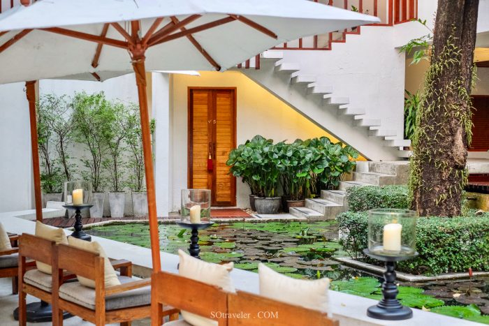 เมื่อมาถึงเราจะพบอาคารสีขาวถูกจรรโลงและตกแต่งในสไตล์ไทยประยุกต์ สะอาดสะอ้าน ดูโล่งตา รอบบริเวณอาคารมีสระบัว และเสียงน้ำตก ทำให้ผ่อนคลายและลืมเรื่องเครียดๆ ที่มีมาตลอดทั้งสัปดาห์
